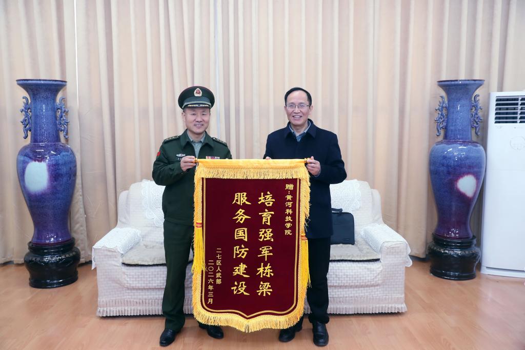 3月18日,二七区人民武装部上校政治委员焦景宏、军事科参谋陈宇博一行专程来到黄河科技学院,赠送印有“培育强军栋梁、服务国防建设”字样的锦旗,感谢学校在二七区2026年春季役前教育训练中提供的优质保障,并对学校长期以来在国防教育、大学生征兵、军训组织、双拥共建等方面作出的突出贡献表示高度肯定。校党委委员、副校长罗煜,校武装部部长张光辉出席赠旗仪式。