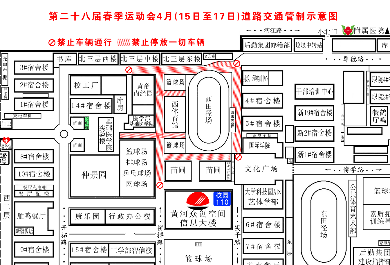 我校第二十八届春季田径运动会将于2026年4月15日(周三下午16时预演)、16日(周四)、17日(周五)在南区田径场举行,为保障校园正常秩序,确保运动会顺利进行,根据《黄河科技学院关于成立第二十八届体育运动会暨第十届“体育文化节”组委会的通知》精神,学校决定于4月15日13时至17日17时对校园部分路段实行交通管制如下: