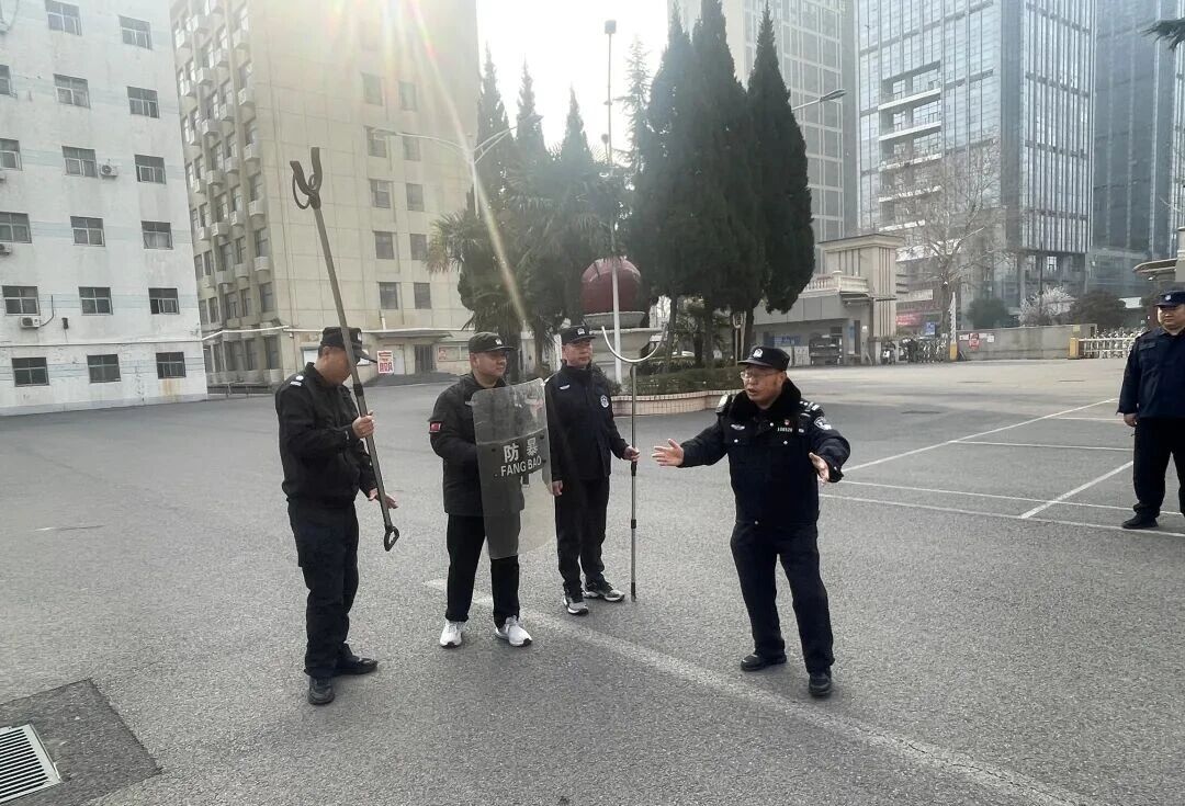 演练模拟一名“歹徒”持刀强行闯入校园,意图对师生安全造成威胁。门岗安保人员第一时间察觉异常,立即拉响警报并启动反恐应急预案。全体安保人员迅速集结,携带防暴盾牌、钢叉、警棍等器械,快速形成第一道拦截防线,阻止“歹徒”深入校园。在总指挥王伟的统一调度下,应急处置小组迅速展开战术配合,利用专业队形对“歹徒”进行包围、周旋与制服,最终成功将其控制并移交至淮河路派出所处理。